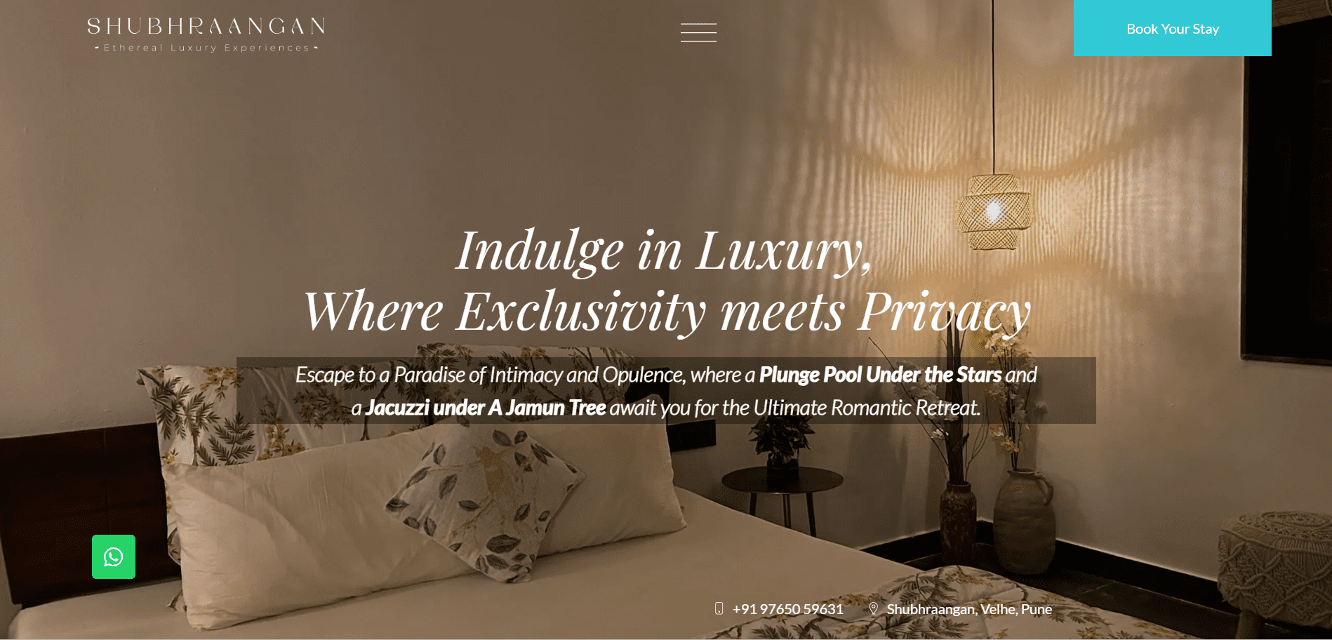 Shubhraangan is a luxurious resort in the middle of nature near Pune, offering couples a serene escape with private pools and Jacuzzis. Located 50 km away from Pune, this resort provides exclusive packages for birthdays and anniversaries.